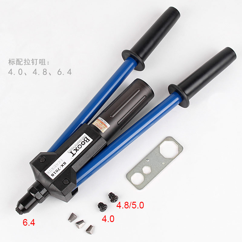 • 產品參數: 拉釘規格:4.0,4.8,6.4mm 工具行程:8mm 工具尺寸:425*150mm 重 量:1.42kg 【雙把】