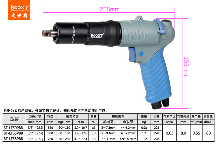 您當前的位置: 首頁 > BOOXT產品中心 > 氣動螺絲刀 > 可調定扭力風批 > 氣動扳手BT-LT60PBB